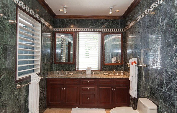 The spectacular entrance and spacious living room also overlook the coastline and boast: built-in bar, stereo system and a covered terrace that wraps around the house giving the possibility of outdoor dining or lounging. The formal dining room is exquisitely furnished. The gourmet kitchen has been completely refurbished and equipped with all the latest amenities including a wood-burning pizza oven to ensure perfectly served meals by the experienced, courteous staff of five.